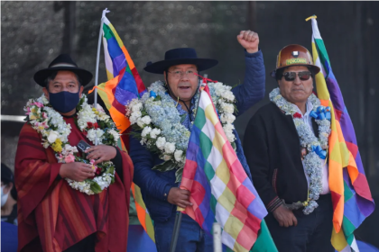 Bolivia's President Luis Arce Catacora gestures next to Vice President David Choquehuanca…
